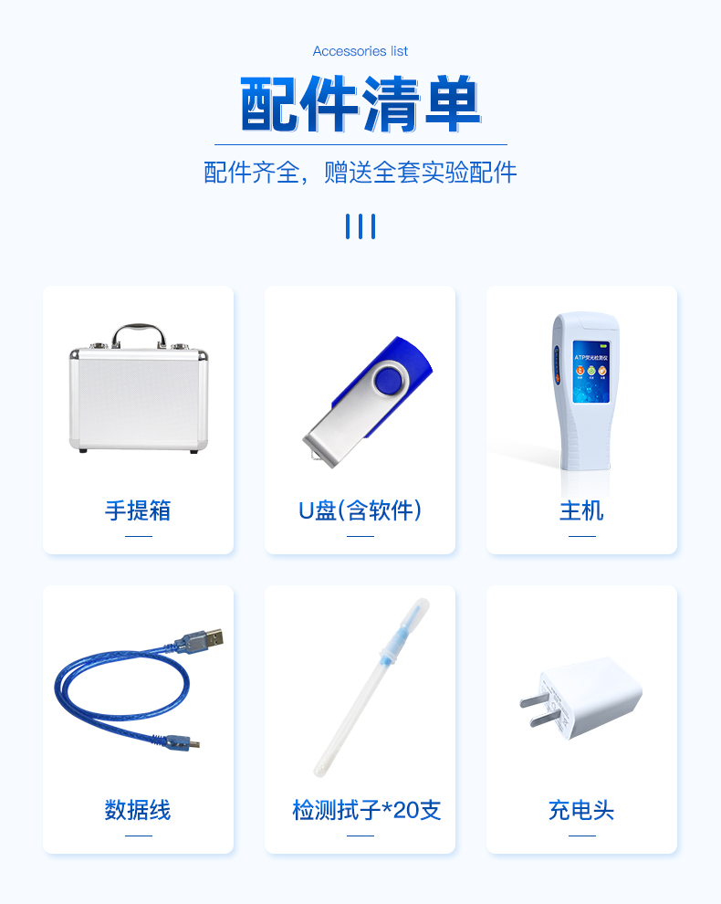 隨機配置:菌落總數檢測儀(手持)主機、鋁合金手提箱、驅動U盤、儀器包、掛繩、PC數據線、數據分析軟件、中文操作手冊
