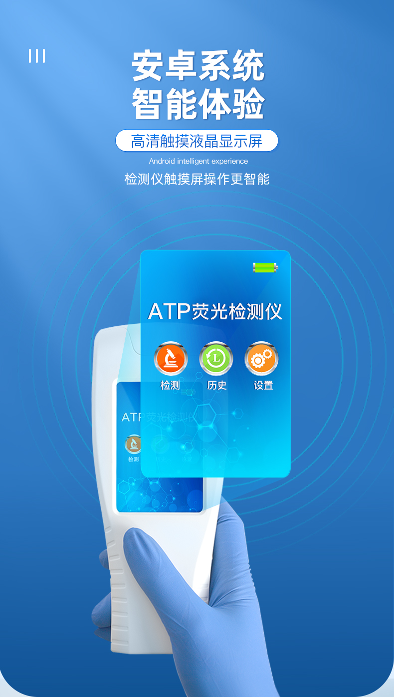 該設備為全新升級產品,大屏幕觸摸顯示屏,代替傳統按鍵。操作采用生物化學反應方法檢測ATP含量,ATP熒光檢測儀基于螢火蟲發光原理,利用“熒光素酶—熒光素體系”快速檢測三磷酸腺苷(ATP)。ATP拭子含有可以裂解細胞膜的試劑,能將細胞內ATP釋放出來,與試劑中含有的特異性酶發生反應,產生光,再用熒光照度計檢測發光值,微生物的數量與發光值成正比,由于所有生物活細胞中含有恒量的ATP,所以ATP含量可以清晰地表明樣品中微生物與其他生物殘余的多少,用于判斷衛生狀況。