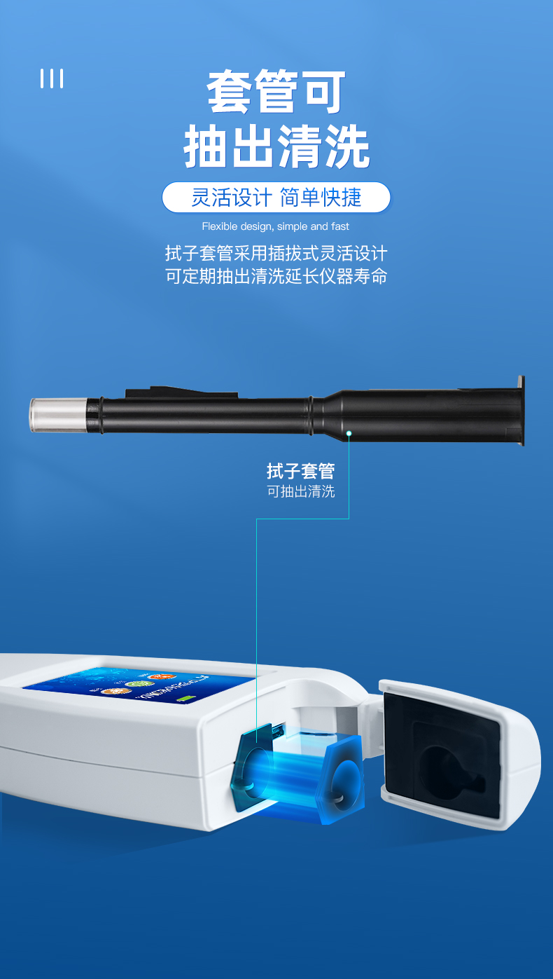 體驗更好 —— 試子套管采用插拔式靈活設計,可定期清洗長期使用,延長儀器壽命。