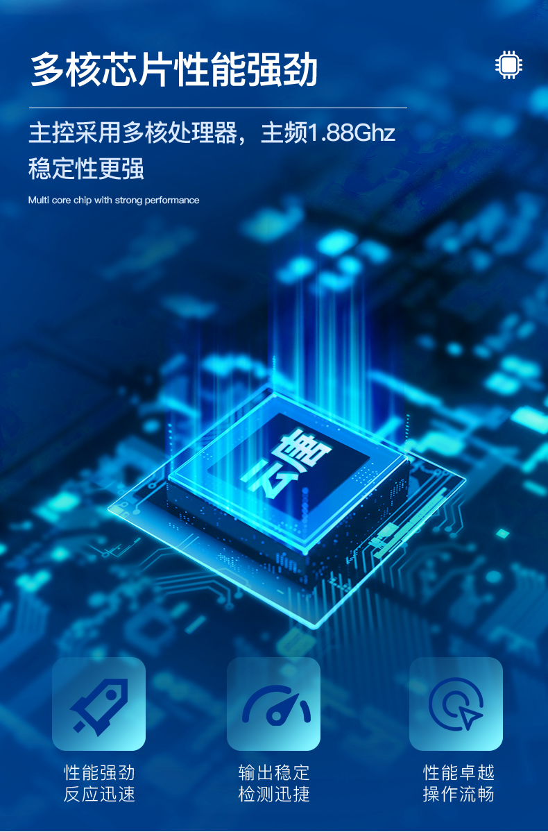 1、儀器采用10.1英寸液晶觸摸屏顯,搭配運行安卓智能操作系統,主控芯片采用ARM Cortex-A7,RK3288/4核處理器,主頻1.88Ghz,運轉速度更快速,性能更強。