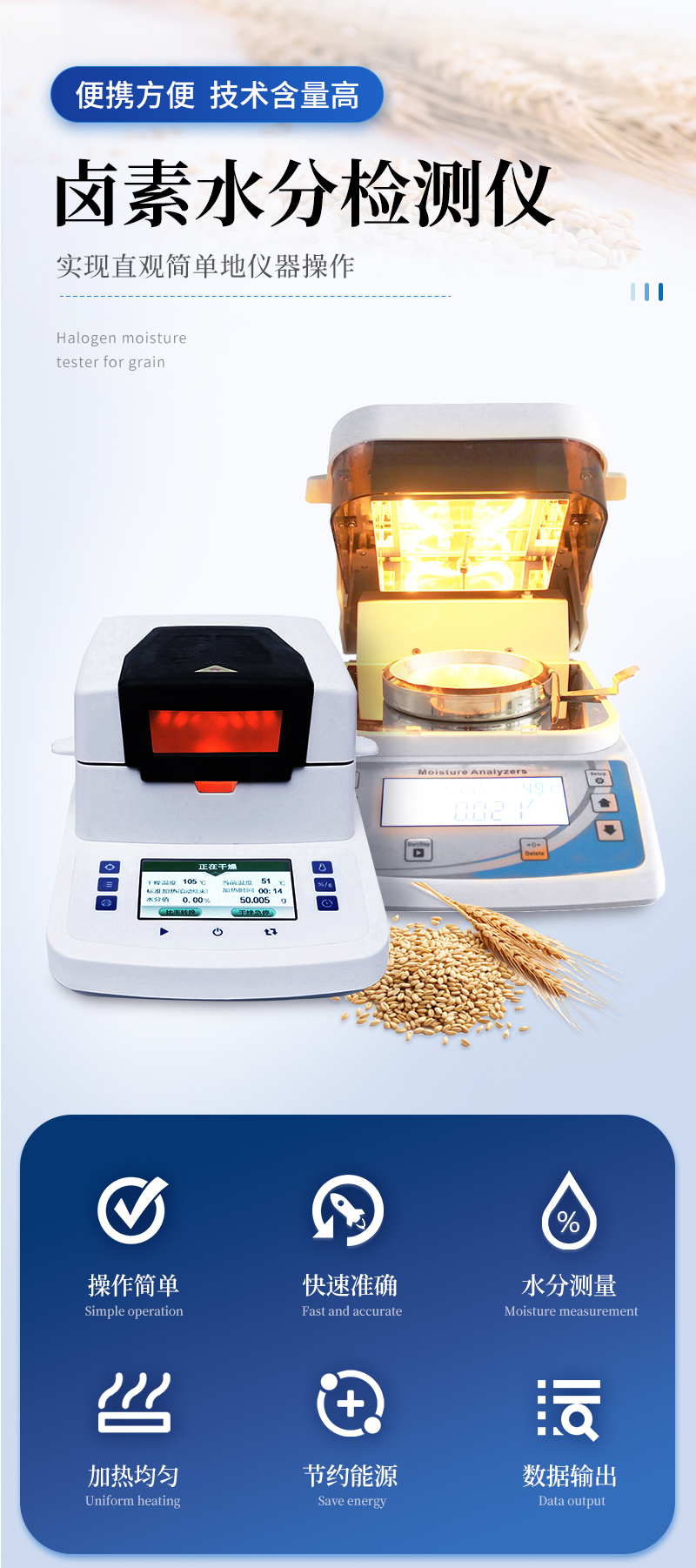 環(huán)狀的鹵素?zé)舸_保樣品得到均勻加熱,操作簡(jiǎn)便、測(cè)量準(zhǔn)確。鹵素水分測(cè)定儀在測(cè)量樣品重量的同時(shí),儀器采用環(huán)形管鹵素加熱方式,快速干燥樣品,在干燥過(guò)程中,水分儀持續(xù)測(cè)量并即時(shí)顯示樣品丟失的水分含量%,干燥程序完成后,*終測(cè)定的水分含量值被鎖定顯示。與國(guó)際烘箱加熱法相比,鹵素加熱可以在高溫下將樣品均勻地快速干燥,樣品表面不易受損,其檢測(cè)結(jié)果與國(guó)標(biāo)烘箱法具有良好的一致性,具有可替代性,且檢測(cè)效率遠(yuǎn)遠(yuǎn)高于烘箱法。智能化操作,一般樣品只需幾分鐘即可完成測(cè)定。該儀器操作簡(jiǎn)單,測(cè)試準(zhǔn)確,顯示部分采用液晶顯示屏-使屏幕更加清晰明亮,示值清晰可見(jiàn),分別可顯示水分值,樣品初值,終值,測(cè)定時(shí)間,溫度初值,*終值等數(shù)據(jù),并具有與計(jì)算機(jī),打印機(jī)連接功能、符合GLP規(guī)范的打印數(shù)據(jù)輸出。