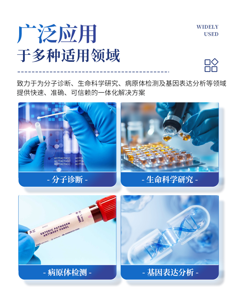基礎科學研究、病原體檢測、肉制品摻假、轉基因檢測、食品安全檢測、藥物開發(fā)及合理用藥、基因表達、水體監(jiān)測、松材線蟲檢測、寵物檢測、養(yǎng)殖業(yè)疫病檢測